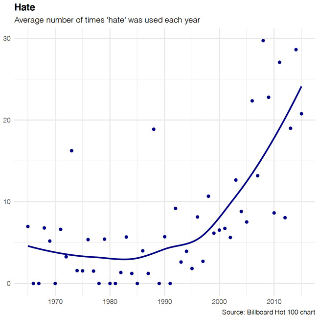 Honestly, I think the author misses the boat on why the songs are getting more negative. (Not sure if she’s been on Twitter recently.) But the data is very convincing that negative words have increased significantly in my lifetime while the use of positive words has declined.