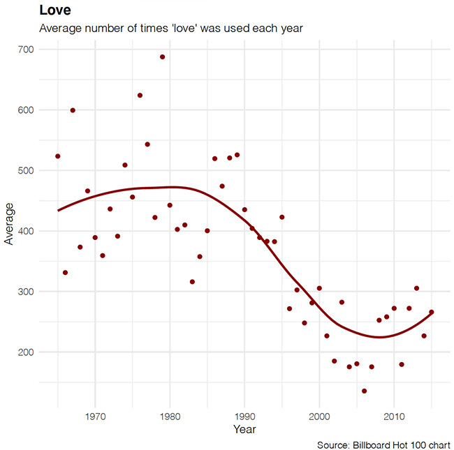 Instead of quoting the article, which is worth reading (at least the first half, because…previous paragraph), I’m going to show you the graphs. FYI, they looked at over 150,000 songs from 1965 to 2015, zeroing in on the Billboard Annual Hot 100 for each year.