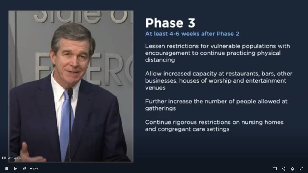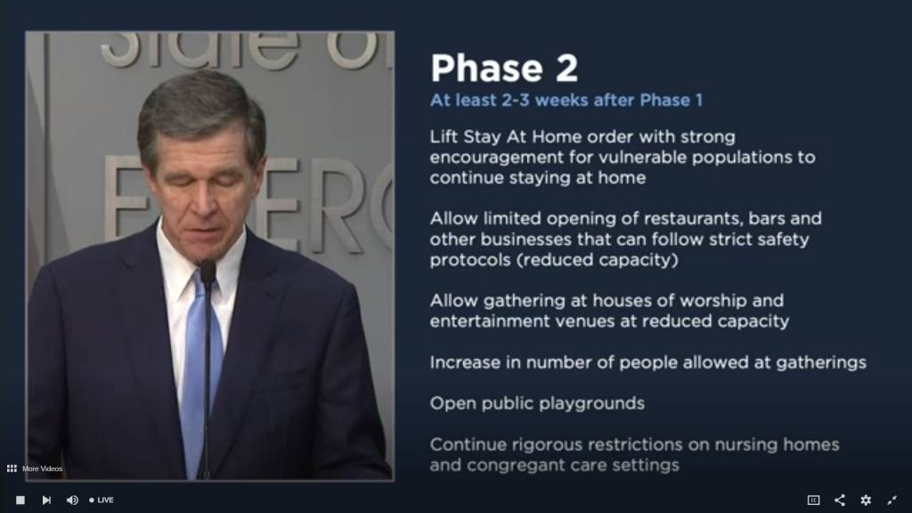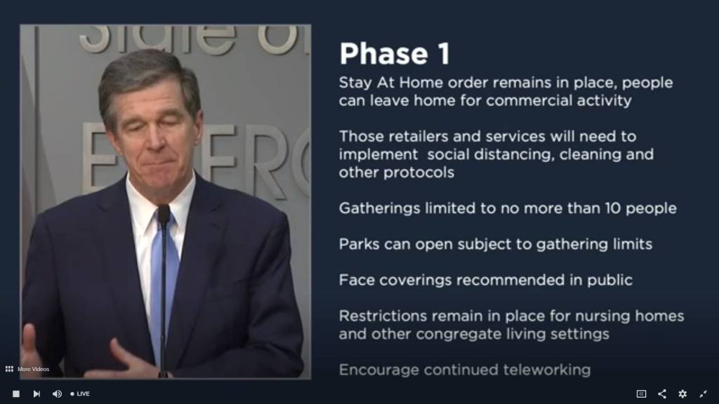 With Governor Cooper’s 3-phase reopening plan, we can begin to strategize toward our path to whatever the new normal will look like. Here are the NC Phases, along with a framework for what that could (emphasis on could) look like for Spout Springs Church.